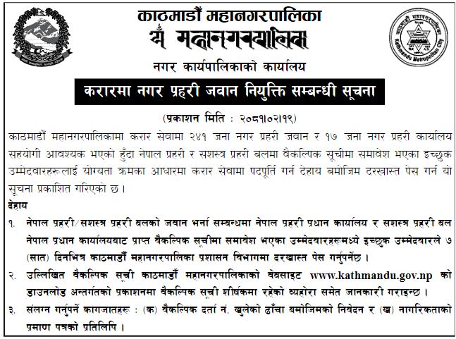 काठमाडौं महानगरपालिकामा करार सेवामा २४१ जना नगर प्रहरी जवान र १७ जना नगर प्रहरी कार्यालय सहयोगीका लागि आवेदन मागेको छ ।