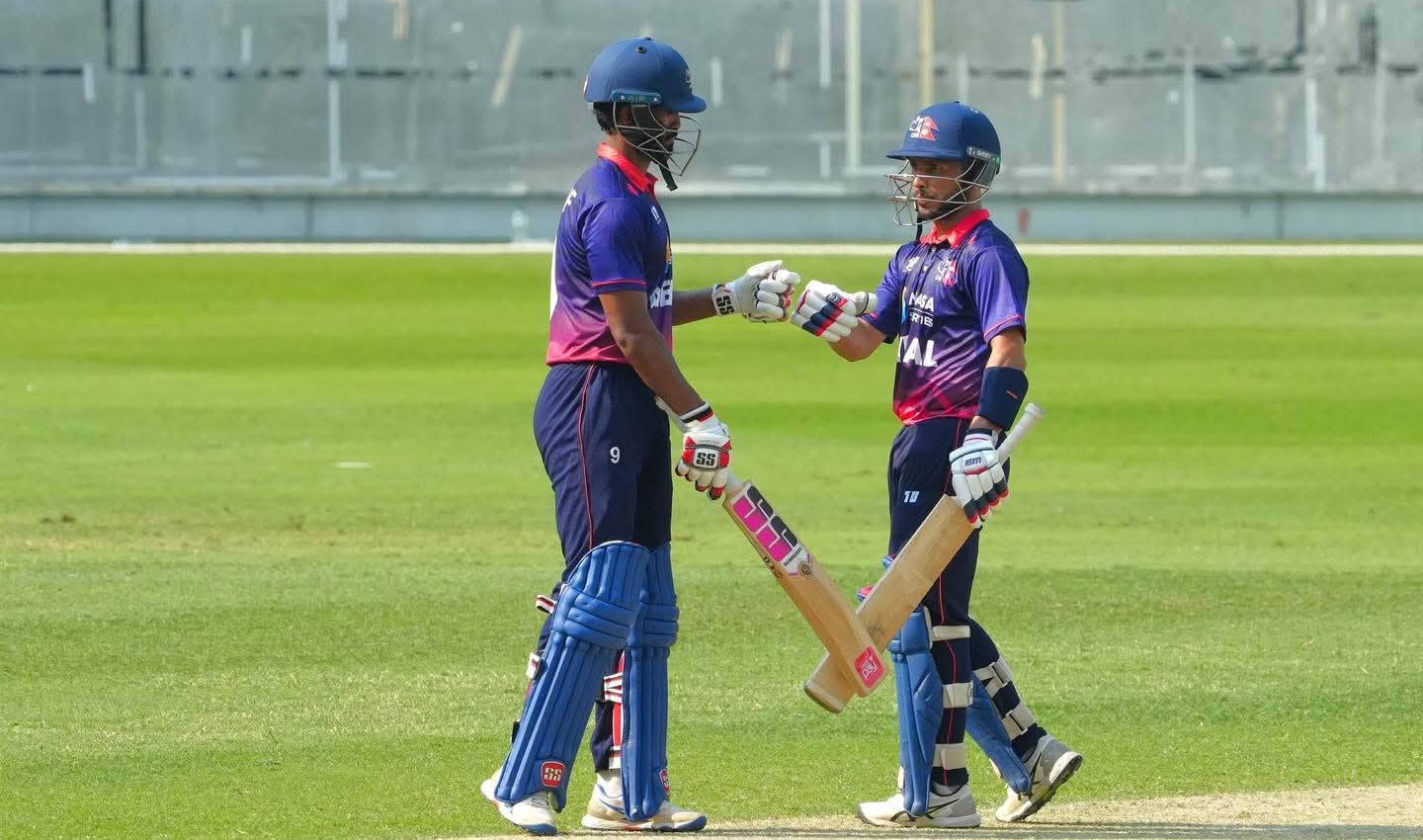 काठमाडौँ (हाम्रो खेलकुद) – नेपालले आज युएई त्रिकोणात्मक सिरिज अन्तर्गत अमेरिकासँग १ सय ६ रनको पराजय बेहोरेको छ। यस हारसँगै अमेरिका लिग टु अंक तालिकाको शीर्ष स्थानमा पुगेको छ। जितको लागि २ सय ६३ रनको चुनौती पछाएको नेपाल ३९.१ ओभरमा सबै विकेट गुमाउँदै १ सय ५६ रनमा अल आउट भयो। नेपालले शुरुवातमै ओपनर कुशल भुर्तेललाई गुमाएको थियो र त्यसपछि पनि कुनै महत्वपूर्ण साझेदारी बनाउन सकेन। कप्तान रोहित पौडेल मात्र २ रनमा आउट भए भने सर्वाधिक योगदान ४० रनसहित दिपेन्द्रले गरे।
